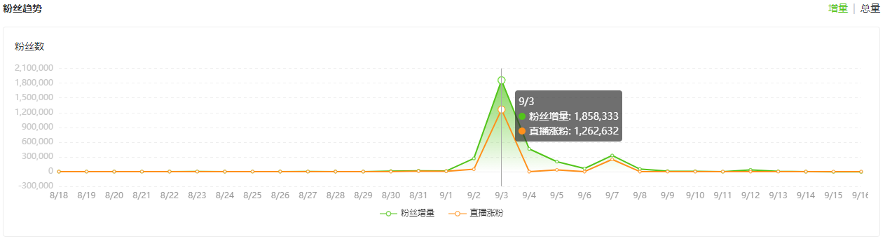 反詐直播連麥在快手走紅後,老陳在抖音上也開啓了直播。據飛瓜數據顯示,其作為反詐宣傳使用的抖音賬號“反詐警官老陳”(截至2021年9月17日,粉絲413.2萬)在一週內(2021年9月1日至2021年9月7日)漲粉數超300萬;值得一提的是,在2021年9月3日當天的直播中,該賬號通過直播漲粉超126萬。