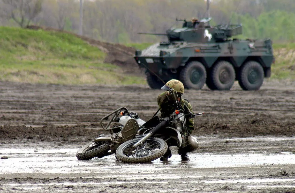 雖然能夠駕駛、乘坐摩托車滲透是比直升機機降後步行滲透快得多了,可俄軍並不吃這一套。如今的軍用摩托車、全地形突擊車同樣可以通過各種降噪措施實現降噪,日本陸上自衞隊裝備的川崎軍用摩托車在開闊平坦的平原地區行駛時,50米外發出的噪音已經接近大自然的背景噪音。