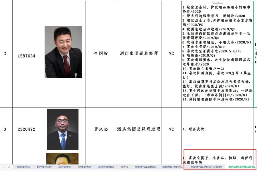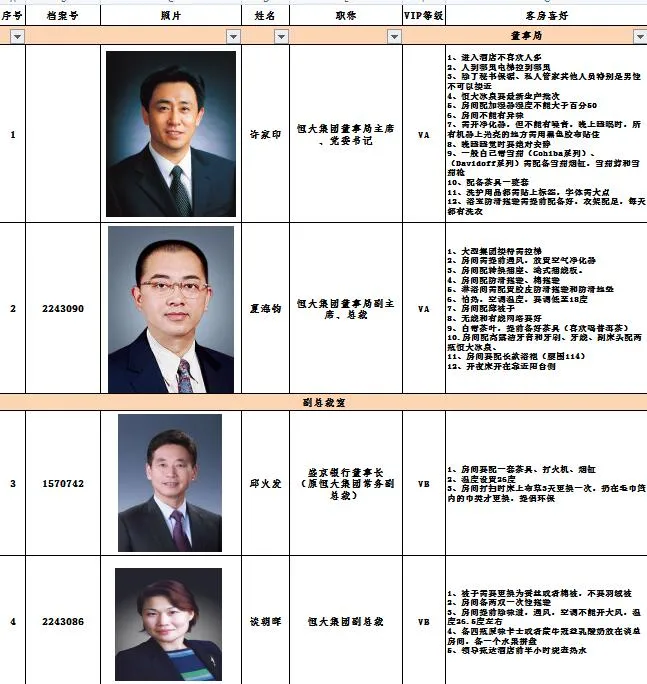 在表中,恒大的集團總部、地產集團、旅遊集團、酒店集團、汽車集團、恒大寶等各路領導日常出行的愛好、習慣、忌口、枕頭、甚至吃的零嘴,都被助理們悉心的編輯成表,堪稱**“帝王級待遇”**。
