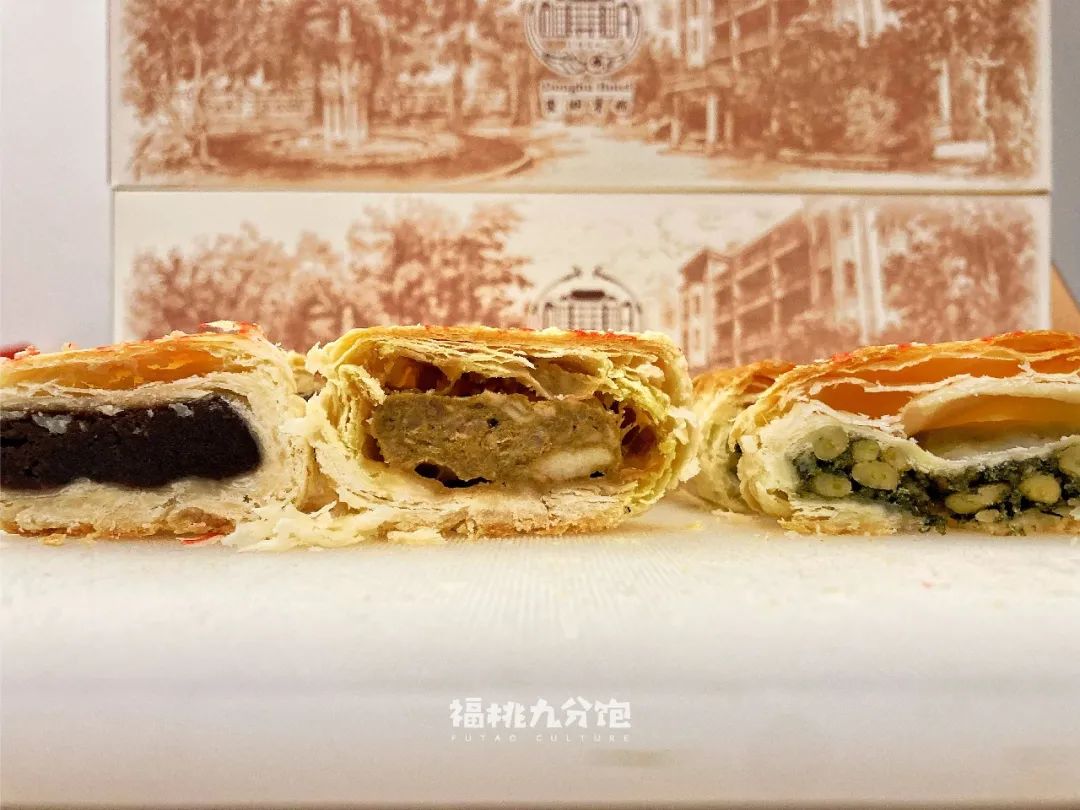 皮是蘇式酥皮,基本用手拍桌子就能震下酥皮屑的水準,而口味則是地道的老上海味道——咖喱鮮肉比純鮮肉增加了一層香料味;苔條松仁則是甜鹹結合,鮮香無比;陳皮豆沙是粵式月餅的經典搭配,這裏的陳皮味道很濃,與蘇式酥皮搭配更顯一番風味。