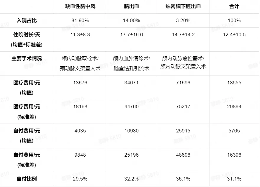 根據2018年醫院質量檢測系統的數據,全年共有3,010,204例腦中風住院記錄,其中81.9%的病例為缺血性腦中風(腦梗塞)。從住院結果來看,約有87%的患者按計劃出院,同時,也有8.3%的患者未遵醫囑出院或在住院期間死亡。患者平均住院時間為12.4天,平均護理費用約為18,555元,平均自付費用約為5,765元。從疾病類型來看,缺血性腦中風、腦出血和蛛網膜下腔出血的醫療費用與自付費用存在顯著差異,這與對應的治療難度有關,如下表所示,與缺血性腦中風患者相比,腦出血和蛛網膜下腔出血患者的醫療費用分別增加了150%和420%。