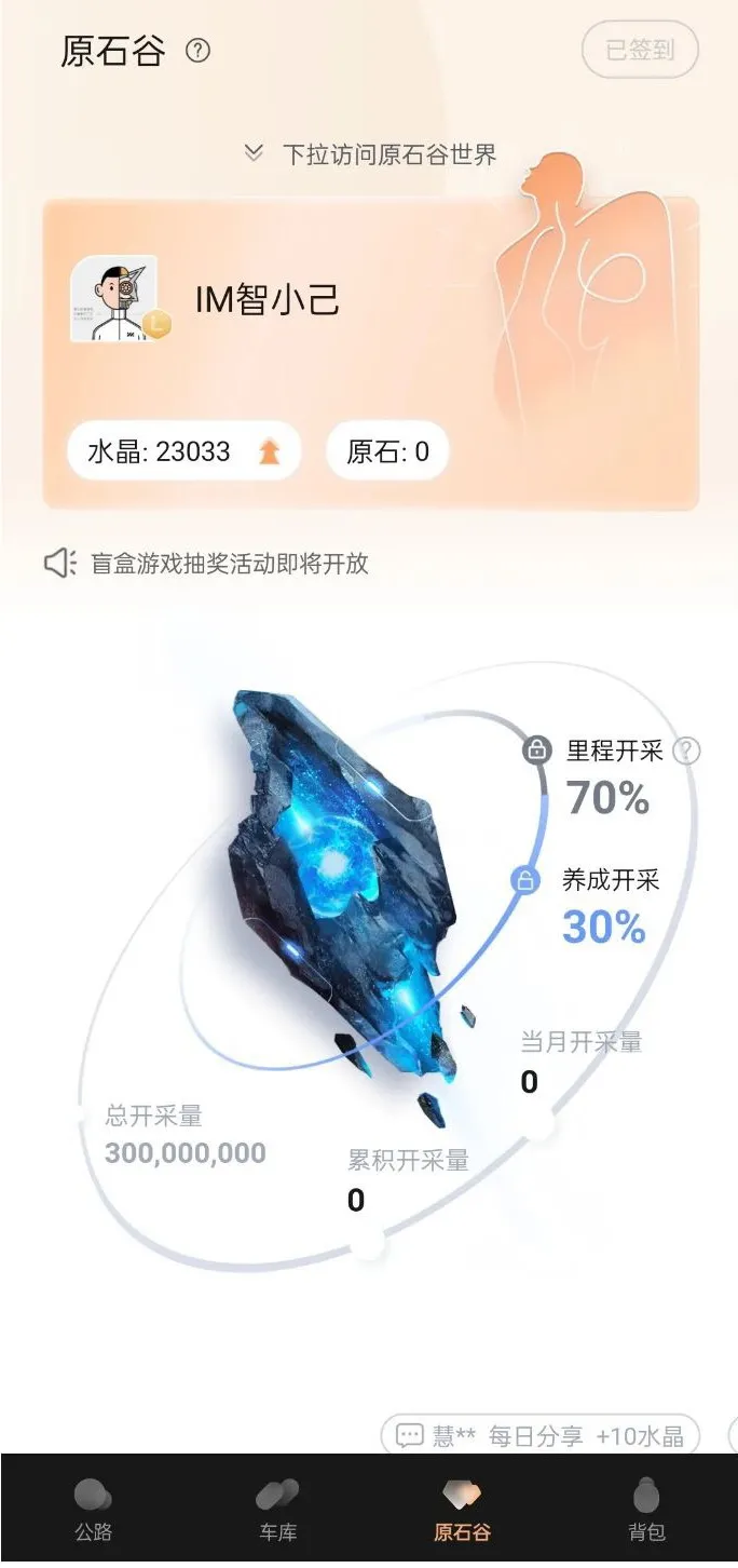 在“原石谷”的虛擬世界中,擁有總量數目恆定為3億的“原石”,用户可以通過兩種渠道獲得原石,一種渠道是養成式開採,用户通過參與智己汽車官方組織的共創活動,或者完成APP互動任務,如簽到、發帖、交流,先贏得積分“水晶”,當水晶達到一定數量後,用户可以參加抽盲盒,便有機會獲得“原石”或“原石碎片”。