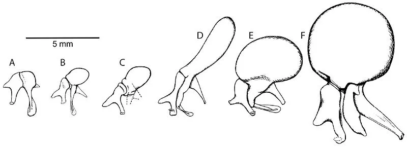 不同種類金鼴的錘骨,從右邊數第二個是荒漠金鼴,第一個也是最大的一個是巨森林金鼴(Chrysospalax villosus),有些金鼴有擴大的錘骨而有些沒有,其中的關係至今尚未完全明白 | Robert J. Asher et al. / MC Evolutionary Biology (2010)