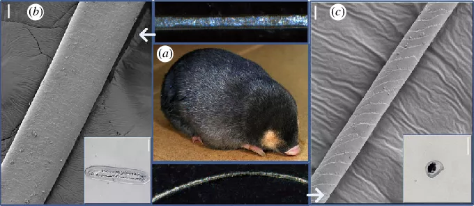 圖a,開普金鼴;圖b,具有虹彩反光的毛髮;圖c,沒有虹彩反光的毛髮 | Holly K Snyder et al. / Biology Letters (2012)