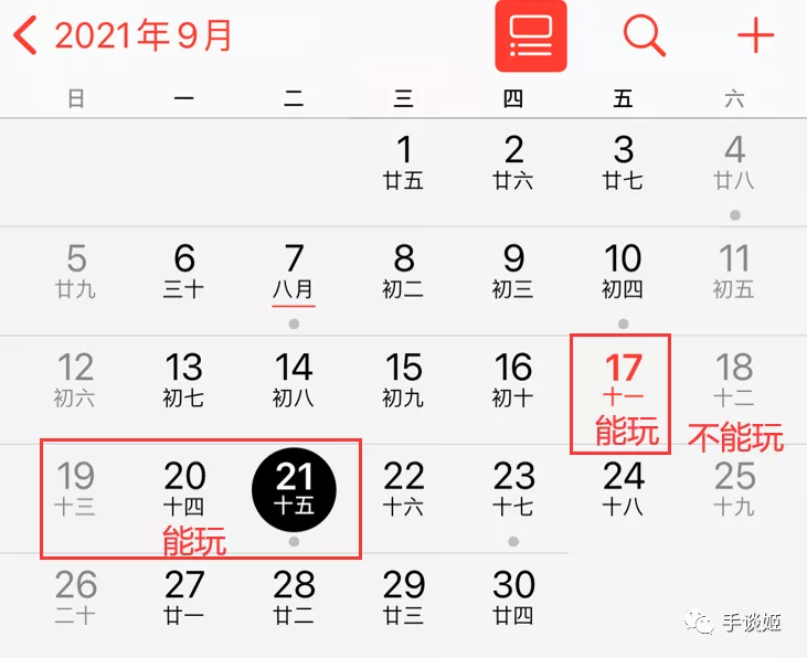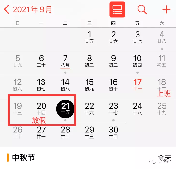 還是拿即將到來的中秋節當例子,今年的農曆八月十五,是本月21號星期二,所以按照上面的規則,放假日期就是19、20、21,也就是週日、週一和週二(中秋節)三天。