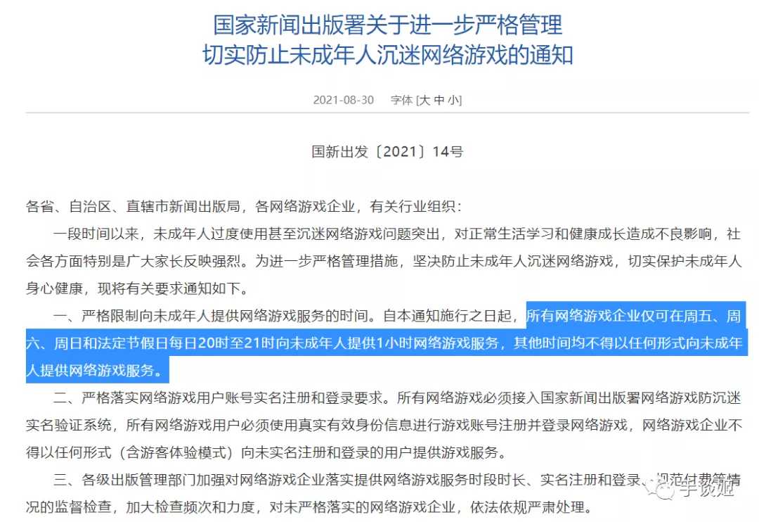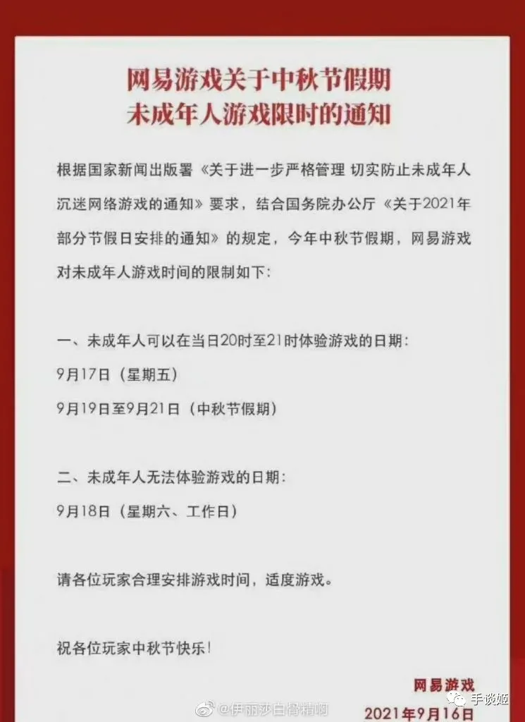 上個月8月30號,國家新聞出版署公佈了《關於進一步嚴格管理切實防止未成年人沉迷網絡遊戲的通知》,這件事引起了不少人關注,根據規定,“所有網絡遊戲企業僅可在週五、週六、週日和法定節假日每日20時至21時向未成年人提供1小時網絡遊戲服務”,問題在於,中秋快到了,這個規定該怎麼實施呢?
