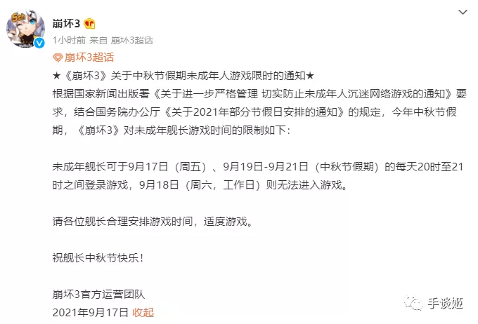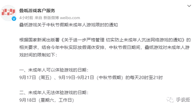 剛才也説了,按照正常的放假情況,休息的時間是19、20、21,週日、週一和週二,共計三天,但是大多數遊戲公司公佈的允許未成年人的遊玩時間分別是17號,19號,20號,21號,也就是週五,週日、週一和中秋節。