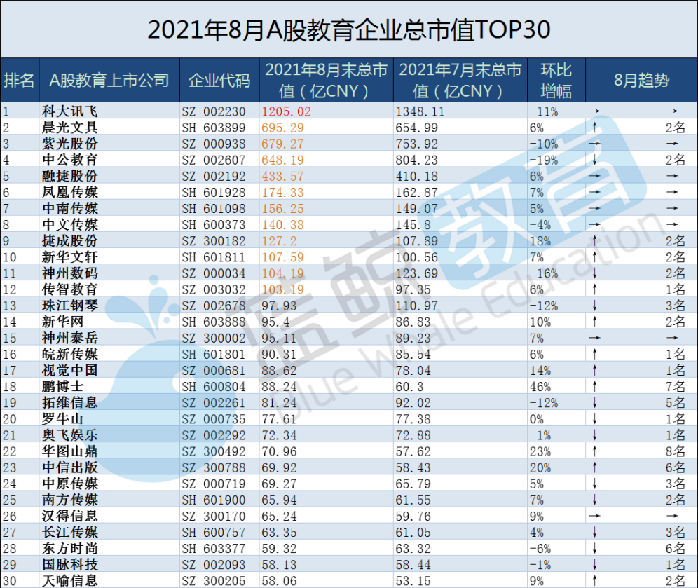 科大訊飛在6月環比上漲9%後,位次由第三位升至第一位,7月繼續維持該名次,總市值為1348.11億元人民幣,較6月環比下降10%,8月末總市值為1205.02億人民幣;位列第二的企業依然是chegg,7月末總市值為812.84億元,較6月末環比上漲7%,位次上漲5位至第2位,8月末總市值為777.84億人民幣;成為第三位的是晨光文具,取代7月末該位次的中公教育,8月末總市值為695.29億人民幣,環比上升6%;排在第四位的是紫光股份,7月末總市值為753.92億元,環比增幅為20%,8月末總市值為679.27億人民幣,環比下降10%;曾經位列第一的中公教育8月末排名第五位,總市值為648.19億人民幣,環比下降19%。
