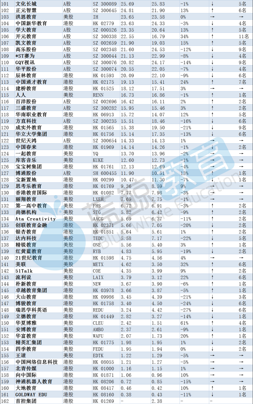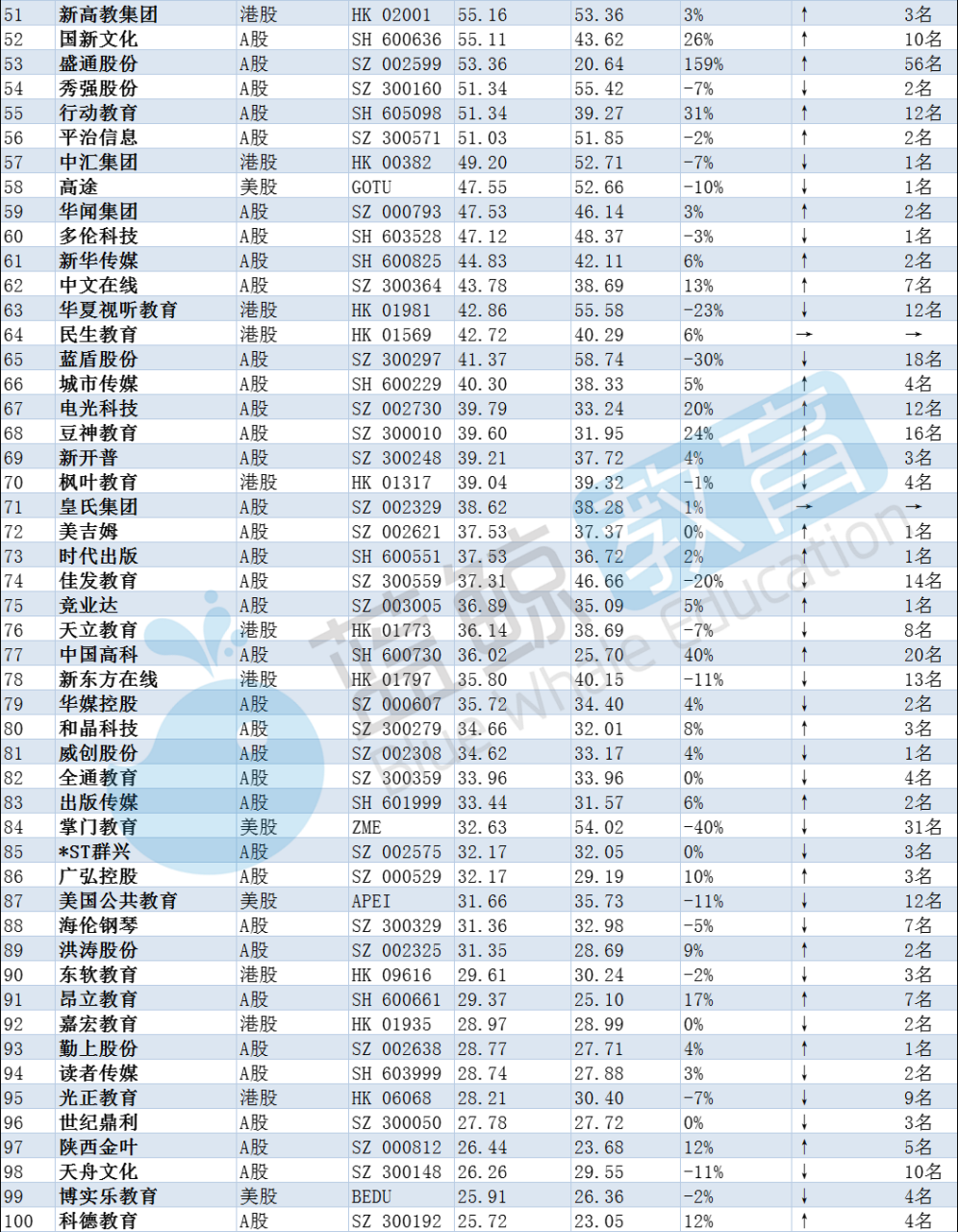 漲幅較大的企業還有:盛通股份(SZ 002599)上漲159%,華夏博雅(CLEU)上漲61%,鵬博士(SH 600804)上漲46%,網易有道(DAO)上漲43%,中國高科(SH 600730)上漲40%,開元教育(SZ 300338)環比增幅為34%……