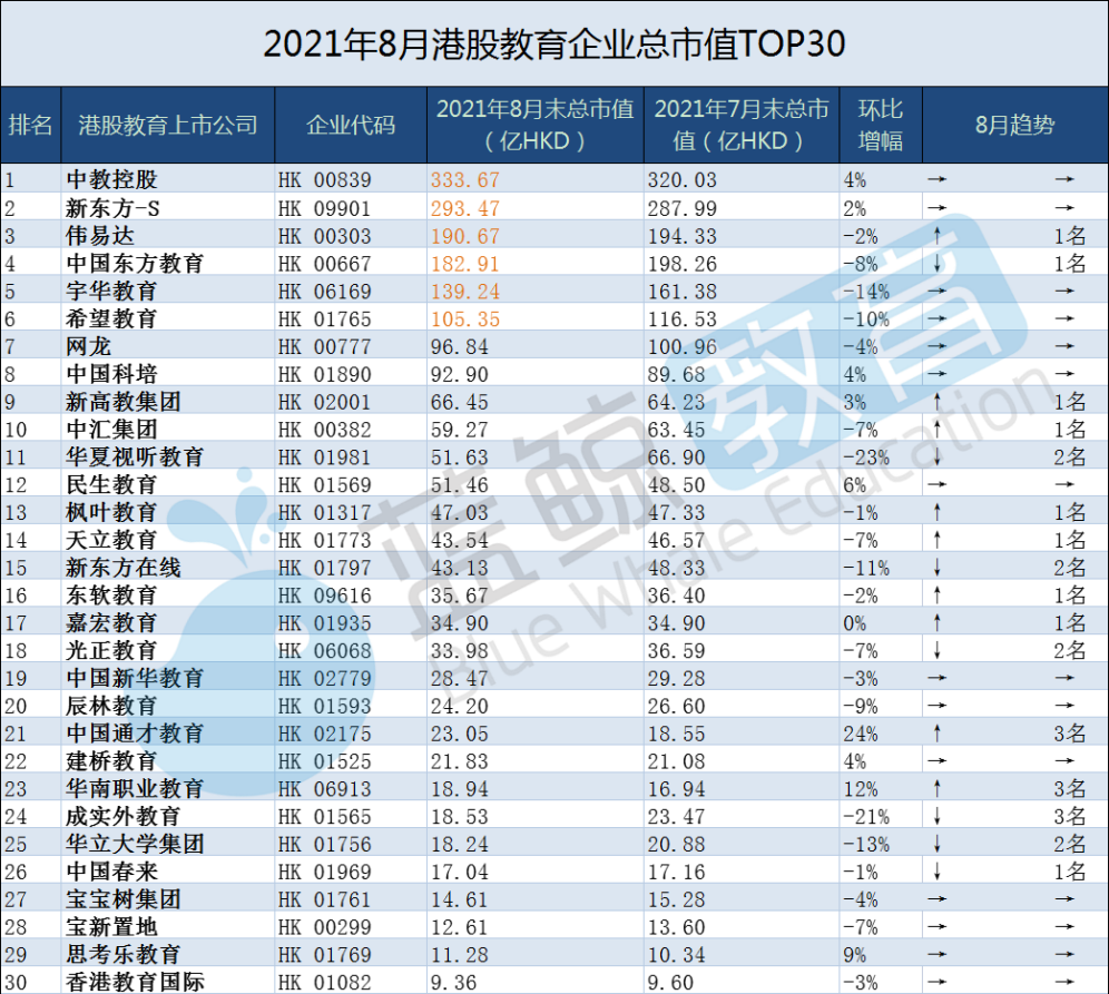與2021年7月末相比,110億港元市值以上企業達5家,分別是:中教控股(HK 00839)、新東方-S(HK 09901)、偉易達(HK 00303)、中國東方教育(HK 00667)、宇華教育(HK 06169)。較7月末減少的是希望教育(HK 01765)。