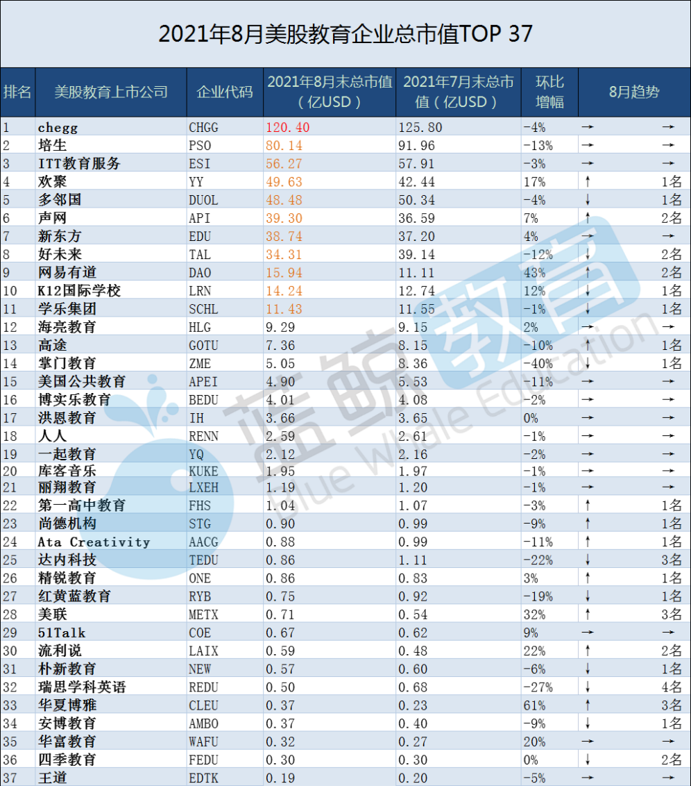 最後,我們來看一下2021年8月末,美股教育企業市值TOP 37。目前由於美股教育企業數量較少,所以全部為大家羅列: