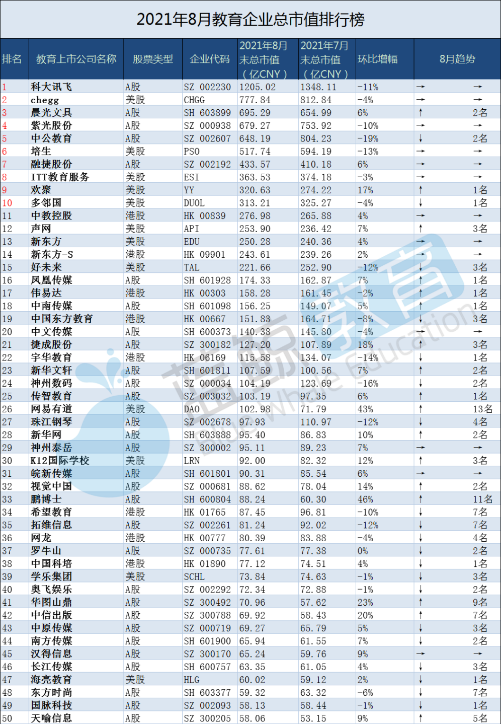 入圍8月總市值排行榜TOP 10企業分別是:科大訊飛、chegg、晨光文具、紫光股份、中公教育、培生、融捷股份、ITT教育服務、歡聚、多鄰國,與2021年7月末相比,數量沒有新增,僅是位次上發生變化。