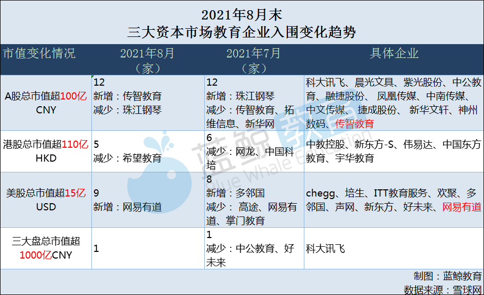 總體來説,2021年8月末三大板塊市值巨頭榜出現變動的企業較7月末有所減少,保持大致的數量上的穩定。A股入圍一家傳智教育,出局的企業是珠江鋼琴;港股出局的企業是希望教育;美股由8家新增至9家,新增的企業是網易有道。