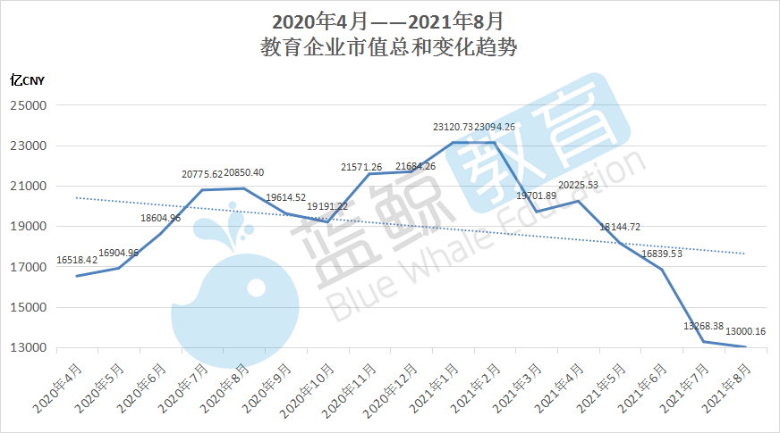 從上圖可以看出,教育上市企業市值在2020年4月開始有連續數月的上漲,直到同年8月迎來小高峯,但在9月和10月又經歷了連續下跌,年末時逐步回升。2021年1月和2月教育企業市值達到一個相對頂峯,上半年整體呈現下降趨勢,7月末出現較為明顯的下跌,市值跌至13268.38億人民幣,較6月末環比下跌21.21%,8月市值13000.16億人民幣,較7月末環比下跌2.02%。