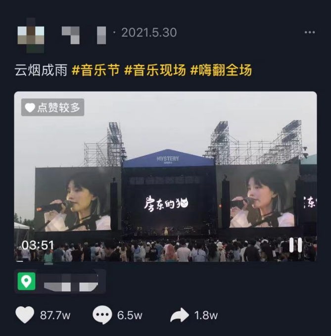 也不盡然是這樣,在抖音上,搜索“音樂現場”,會看到今年由用户自己拍攝上傳,原創歌手房東的貓的代表歌曲,得到了87.7W人點贊。在緊接其後的一系列在搜索信息流中,無論是節目片段或是音樂節現場,都有過萬的點贊率。
