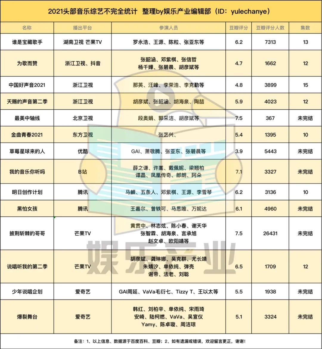不過,隨着越來越多垂類綜藝的突圍,短視頻的崛起,成功搶佔用户碎片化時間,音樂綜藝的路,變得越來越不好走了。**娛樂產業編輯部(ID:yulechanye)**整理了今年各家頭部音樂綜藝,試圖洞見這其中發生變化的具體緣由。