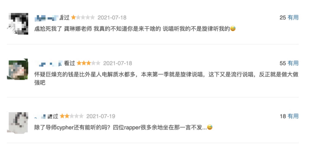 以嘻哈賽道為例。作為擅長綜藝的芒果TV出品的續集,《説唱聽我的第二季》也想嘗試創新。在第一代節目的“旋律説唱”策略下,節目誕生了有幾首還算有水花的音樂。比如俞天時KOZAY與Rarpid望江晴合作的《天上的星星不説話》,曾在QQ音樂公佈的《2020Q3華語數字音樂行業季度報告》中拿到季度綜藝歌曲TOP10的前三名。而第二季,芒果TV選擇讓《説唱聽我的第二季》全面流行化,整合了龔琳娜、胡彥斌與不同嘻哈歌手,卻沒能討好觀眾。