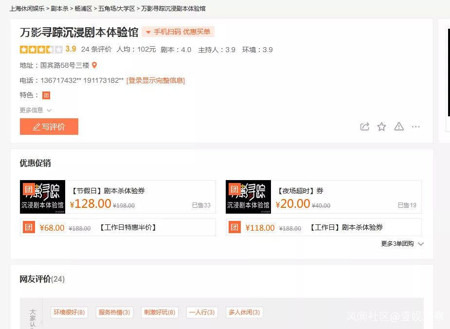 上海五角場萬達影城“萬影尋蹤”,雖然只有3.9店鋪評分,24條評價,但也有單月52的單團購數據,數據還算亮眼。在評價中,網友也廣泛讚美了“影院+劇本殺”新穎場景體驗。“在等電影的時候來場劇本殺,或者劇本殺完了再來場電影。這個體驗還是很爽的。”進行過雙重體驗的網友如上評價。