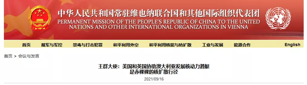 同一天,中國常駐維也納聯合國代表王羣大使也在國際原子能機構9月理事會上發言,就美國、英國宣佈協助澳大利亞發展核動力潛艇項目一事初步表明中方的嚴正立場,指出美、英此舉是赤裸裸的核擴散行徑。
