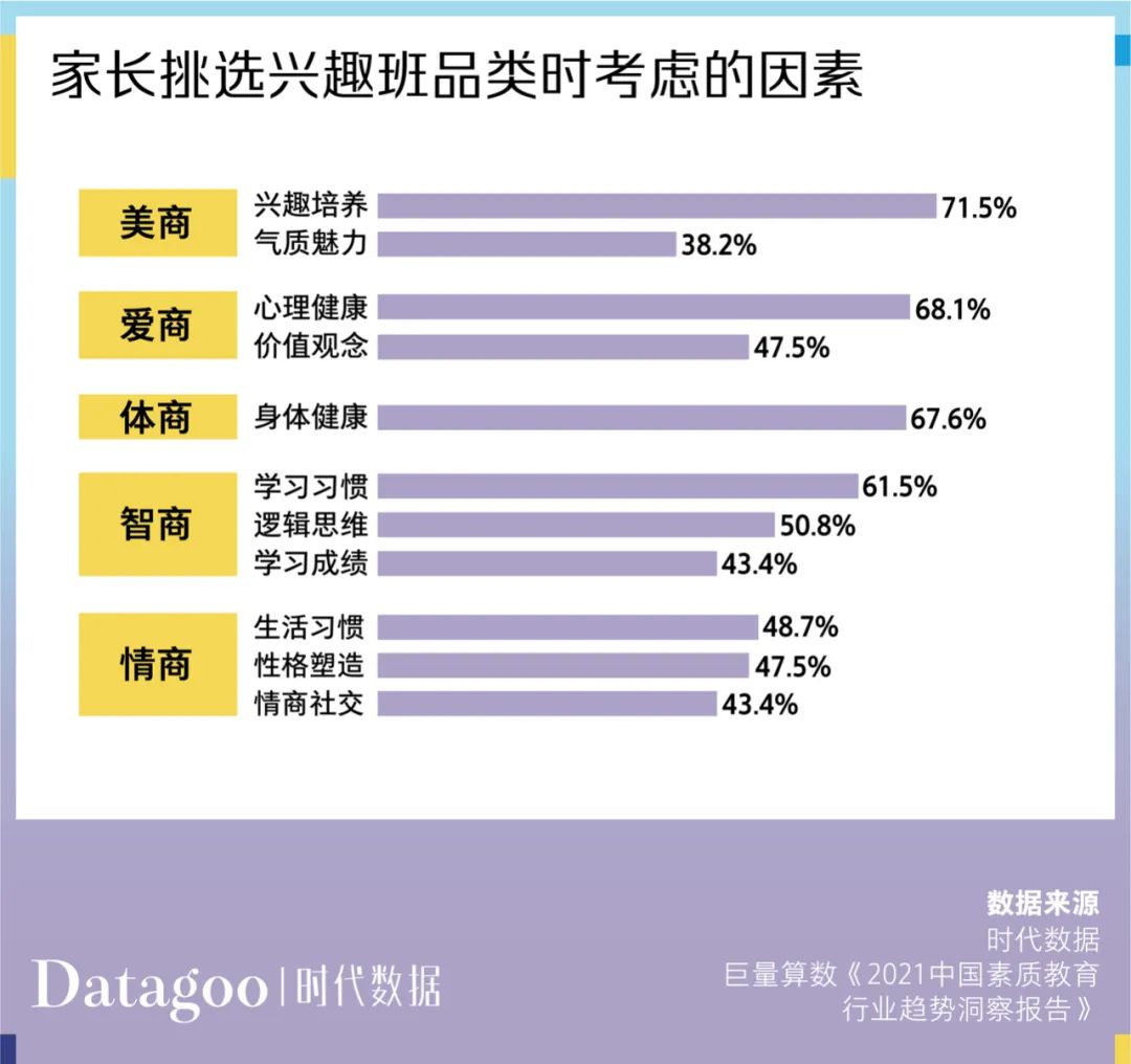 據調研,家長對興趣班的期許中,最為看重的是未來孩子在“美商”、“愛商”與“體商”層面的提升。