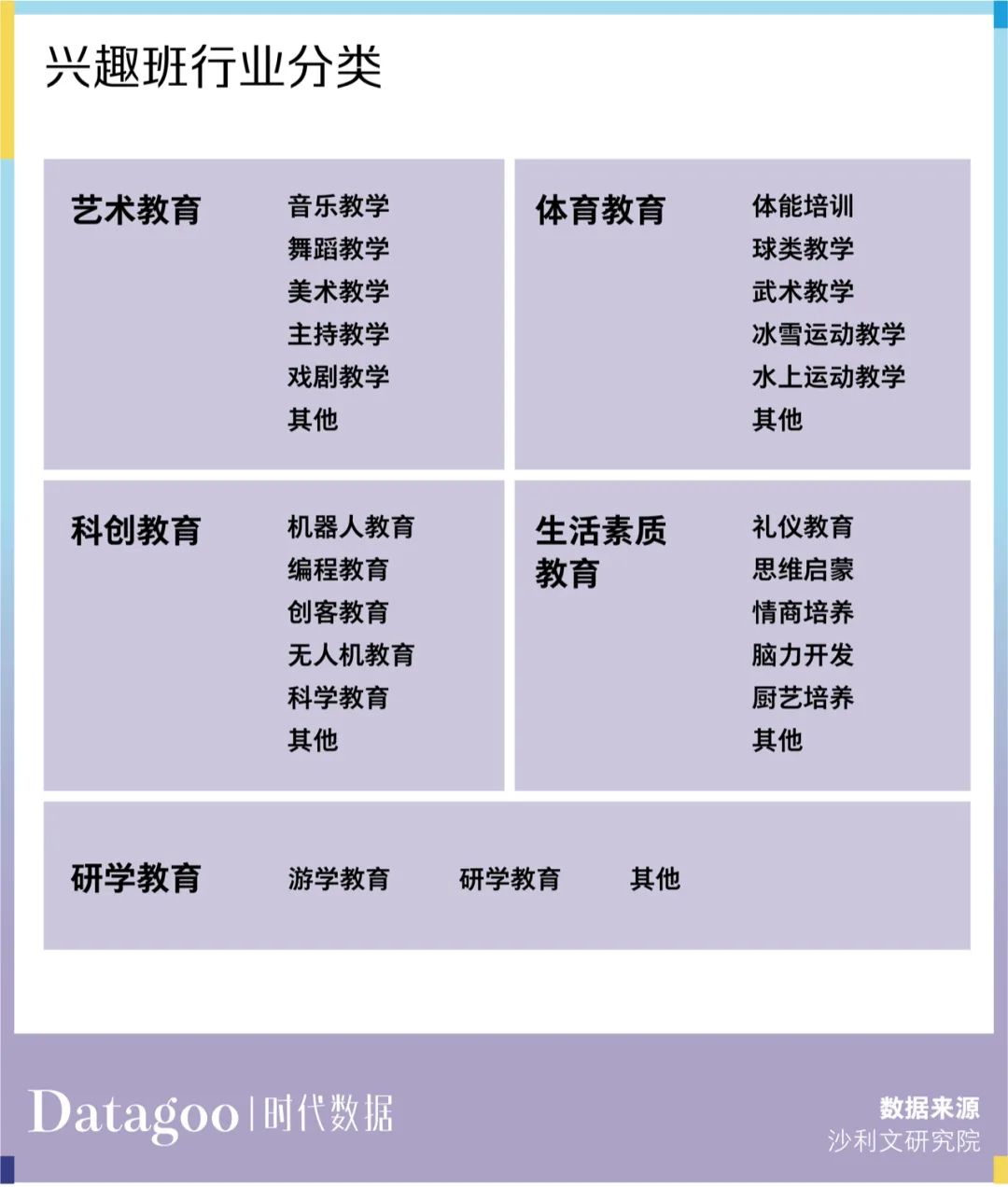在行業實踐中,興趣班中大體上有藝術類興趣班、體育類興趣班、科創類興趣班、生活素質類興趣班及“研究性學習”和旅行體驗相結合的研學教育等門類。