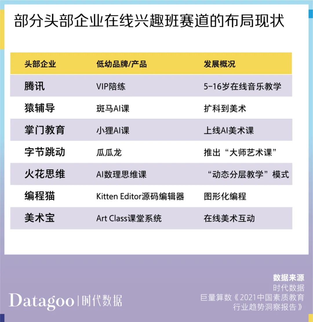 猿輔導、掌門教育、字節跳動、美術寶等紛紛上線斑馬 AI 課、小狸 AI 課、瓜瓜龍和 Art Class 課堂系統等品牌及產品,積極佈局在線美術教育;騰訊、火花思維及編程貓等則押注在線音樂、編程教育等。