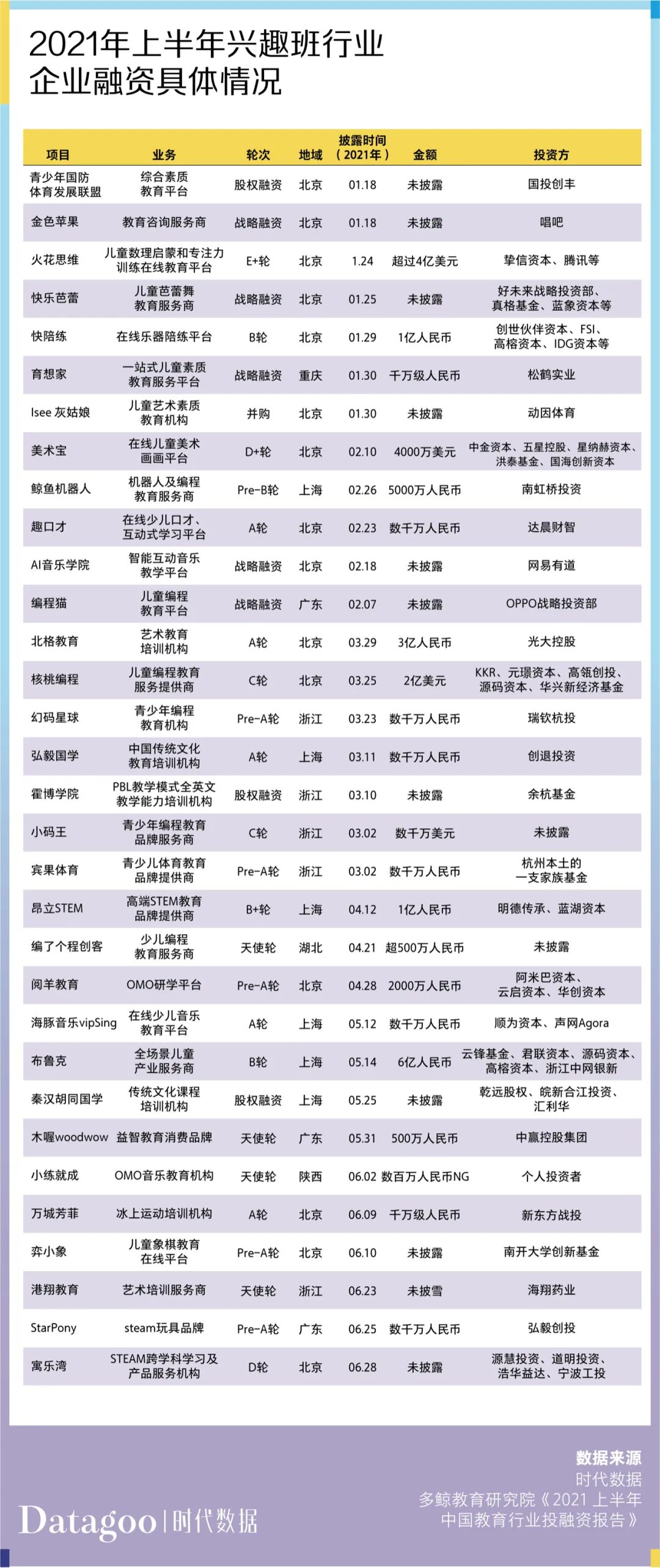2021 年上半年,以興趣班為主的素質教育賽道展現了強勢的吸金動能,融資總金額高達 38.6 億元,幾乎與 2020 年的融資金額相當,並與企業服務和職業教育一起瓜分了上半年融資總金額的近八成。