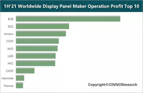2021年上半年全球面板企業總營業利潤超出110億美元,創歷史新高,全球僅四家面板廠營業虧損。