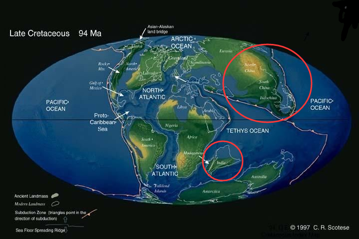 晚白堊紀的板塊示意圖,紅圈內的分別是印度和亞洲板塊©C.R.Scotese