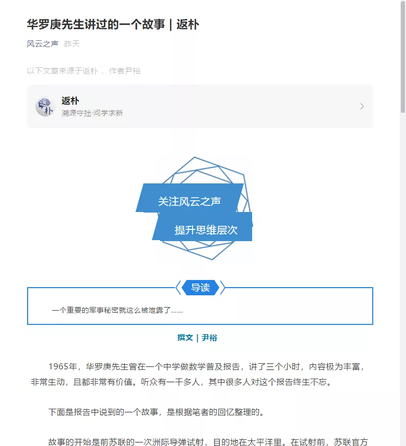 以前我就聽説過,華羅庚先生(圖一)從蘇聯導彈發射場的形狀中分析出了軍事秘密,但不知道是怎麼做的。最近,我看到一篇文章《華羅庚先生講過的一個故事 | 返樸》(參考圖二文章),專門講了這件事。