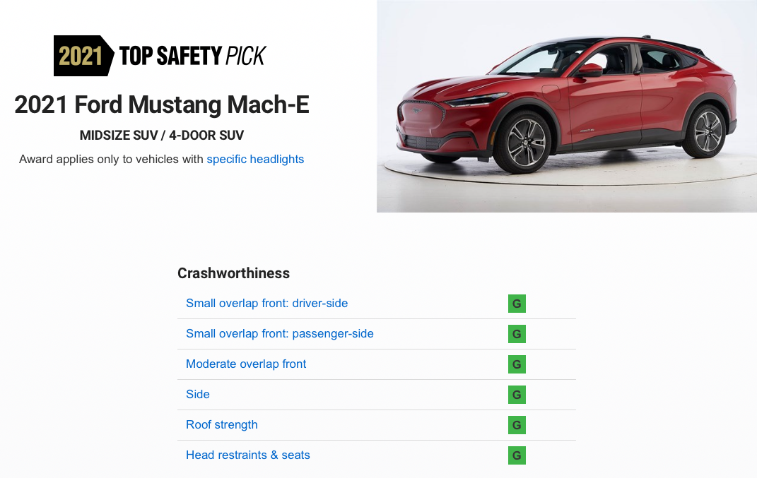安全方面,Mustang Mach-E 入選 IIHS 2021 TOP SAFETY PICKs,各方面幾乎全優的表現保證了乘員的安全。也能夠相應打消大家對於電車不安全的質疑。