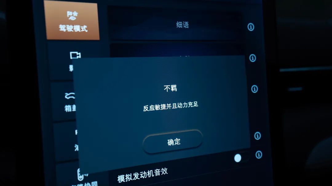 NVH 的表現同樣不俗。坐上車,關上車門,這種感覺就好像你打開了主動降噪耳機的開關。搖下車窗,雙層夾膠玻璃的配備果然跟我所猜想的一致。當車輛跑起來,風噪和電機的聲音處理得同樣不錯,值得注意的是我們可以在車內打開模擬聲浪來增添一份駕駛激情。