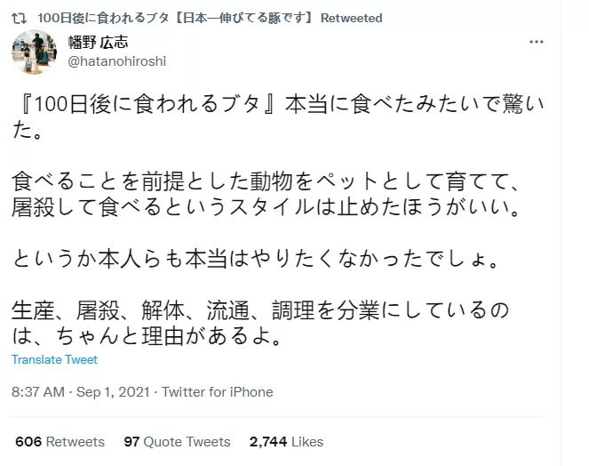實際上,“100天后要被吃掉的豬”非常清楚自己的計劃引起的道德討論——頻道的官方推特經常瀏覽網友的針對此事的言論,且會點贊兩個意見方向完全相悖的言論。
