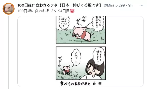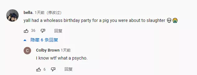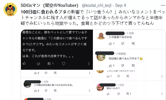 “因為受’100天后要被吃掉的豬’的影響,很多寵物頻道評論區出現了‘你什麼時候吃’這樣的評論”。