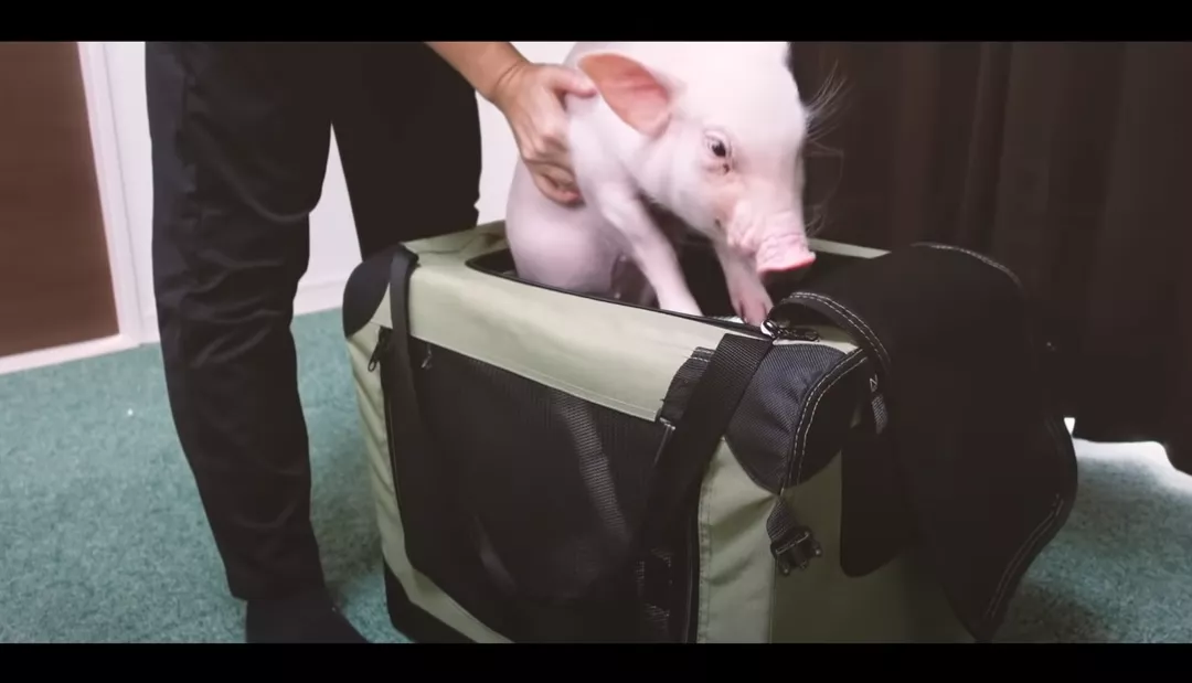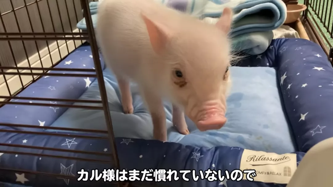 視頻中迷你豬懵懂又好奇地到處探索,和主人熟絡後用鼻子拱他的手臂。Cal還有一個整齊漂亮的大籠子,裏面擺着早已鋪好了的毯子。一切看上去和養寵物日常沒什麼不同。