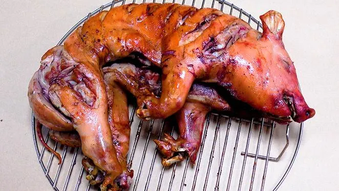 接下來,在舒緩哀傷的音樂中主人開車回家,然後將盒子從車上抱了下來搬進廚房。打開盒子,一隻和Cal身量差不多的小豬呈現在鏡頭前。小豬通體慘白,雙目緊閉。這樣的情況沒持續太久,博主很快把它提進了室外準備好的烤箱中。最後,一盤通紅的烤乳豬被擺在人們面前。