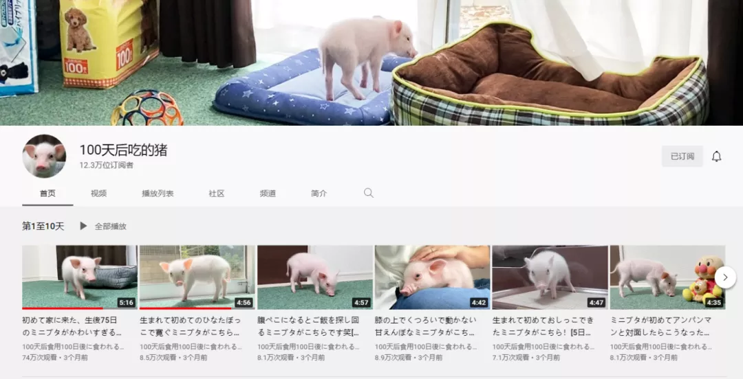 “100天后要被吃掉的豬”頻道引人矚目的點非常直觀,以視頻主角死亡為終點,以視頻內容進行倒計時。每個視頻的長度都挺短,平均在3分鐘左右。