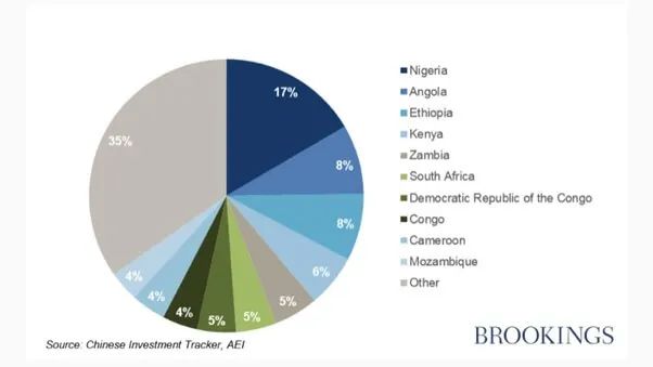 根據布魯金斯學會(Brookings)的説法,中國在非洲的投資主要集中在交通和能源領域。
