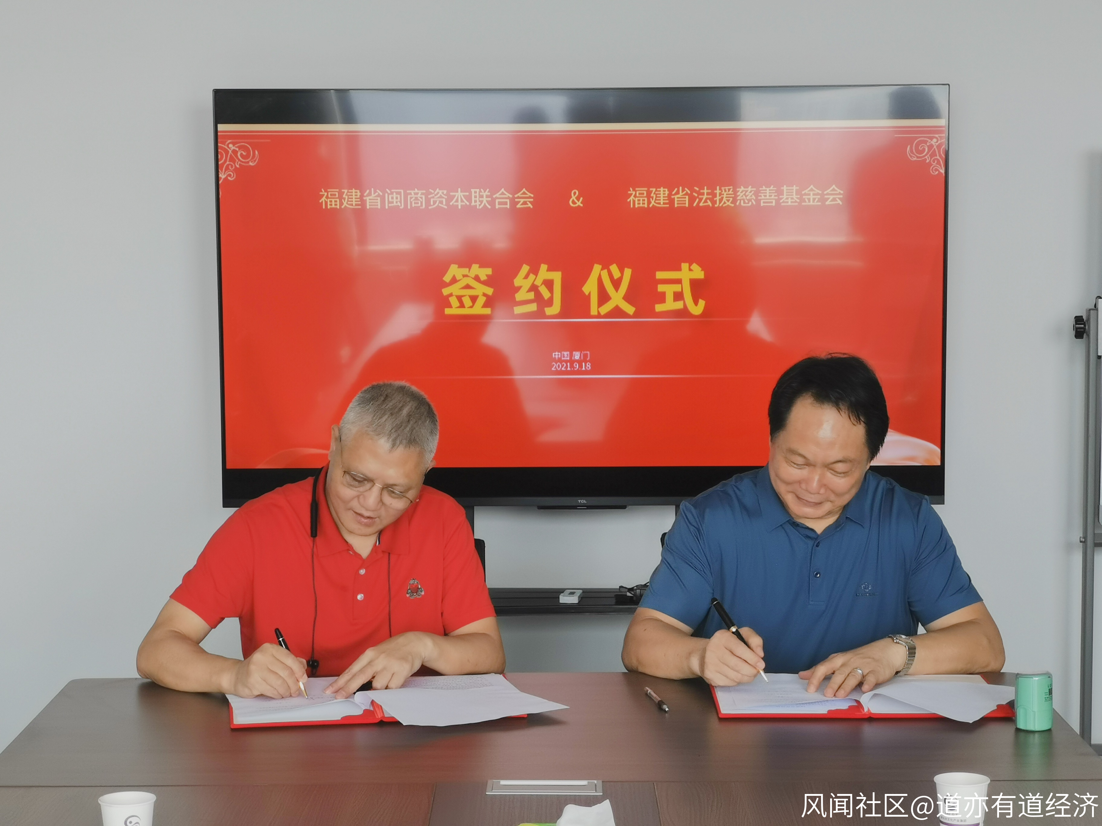 2021年9月18日上午,福建省閩商資本聯合會執行會長杜煌南與福建省法援慈善基金會理事長李小海在廈門市天地金融港簽訂《戰略合作協議》,決定共同推動成立“全球閩商資本法律研究院” 及“閩商資本法律援助中心”,開啓“資本向善、與法律共生”新機遇。