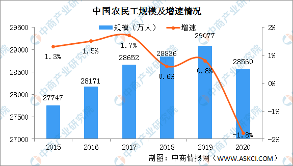 《2020年中國農民工數量及收入情況分析:總量減少517萬 月均收入突破4000元》,中國情報網