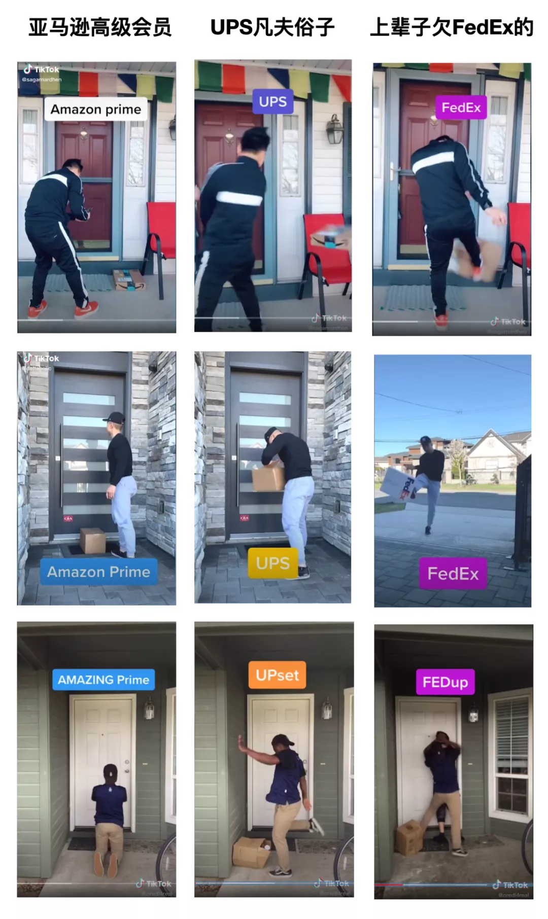甚至連Tiktok上都有網友專門拍視頻內涵各路快遞公司的服務現狀:亞馬遜的prime會員服務,服務態度認真謹慎。UPS能給你送到,但不保證東西完好。