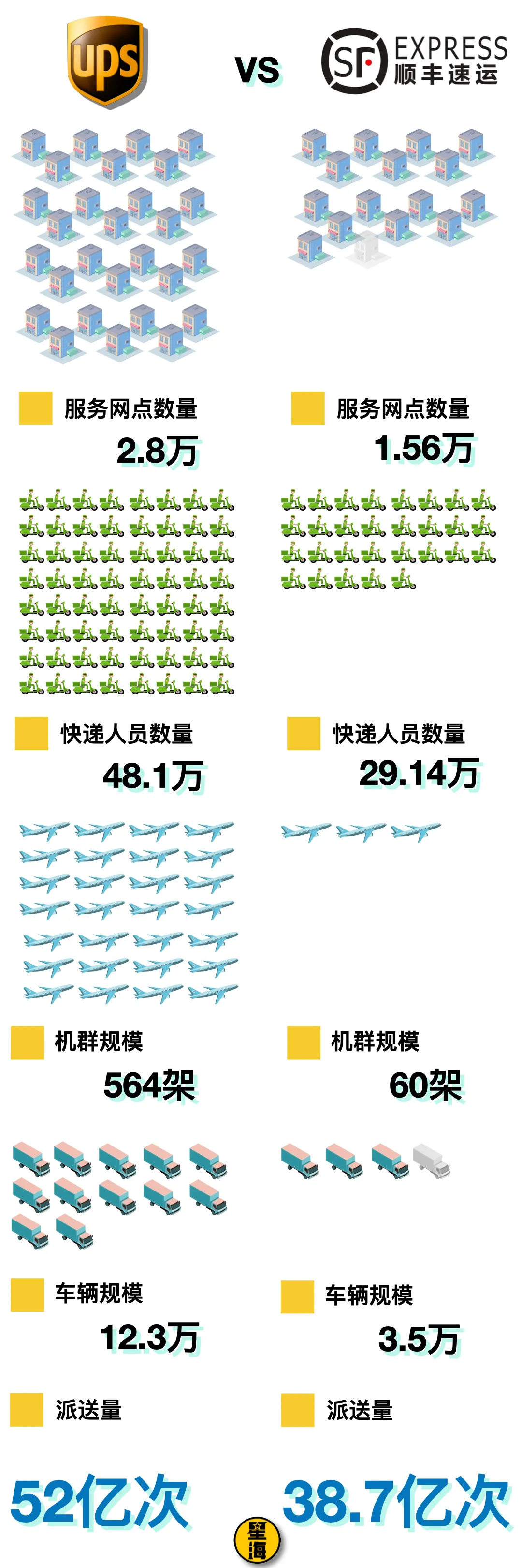 相比之下,順豐的規模要小得多——網點只有1.56萬個,工作人員也只有29萬出頭,機羣和車隊的規模都只有對方的零頭——順豐機羣只有60多架,幹線運輸車也只有3.5萬輛。