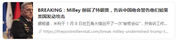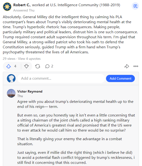 我絕對贊成。米利將軍平息了他的解放軍同行對特朗普當時明顯惡化的心理健康狀況的擔憂,他做了一件明智的事情。特朗普誇張的言辭產生了嚴重的後果,他讓人們,尤其是軍事和政治方面的領導人不信任他就是這樣的後果之一。特朗普在整個任期內一直都需要成年人來監督。我很高興當特朗普的精神病威脅到所有美國人的生命時,意志堅定的愛國者、誓言捍衞憲法的米利將軍堅定地引導了特朗普。