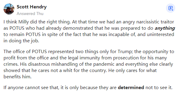 我認為米利做了正確的事。因為當時我們有一個憤怒的,自戀的叛徒做總統。他已經證明,儘管他沒有能力,也沒有興趣做這項工作,但他準備做任何事情來保住他的總統寶座。