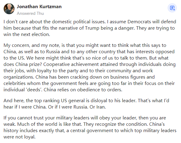 但即便如此,你能誠實地説説,一位現任參謀長聯席會議主席打電話給美國最大的競爭對手的一位高級軍事官員,並承諾如果美國發動襲擊,他會提前打電話通知他,這一點都不令人感到意外嗎?