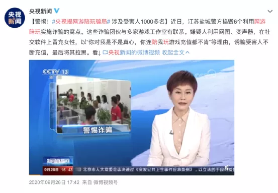 2020年9月,央視新聞曝光了一起“陪玩騙局”詐騙團伙利用網圖、變聲器等在各類社交軟件上註冊女性賬號,以談戀愛為名義誘導受害人充值獲利,涉案金額高達200萬,涉及受害人達到近1000名,最終有61名犯罪嫌疑人落網。