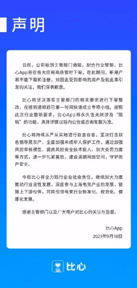 近日,“網信上海”發文稱,遊戲陪練應用比心App存在多個賬號利用低俗、軟色情信息誘導未成年人蔘與陪玩、誘導玩家用户下單等問題。對此,比心APP發佈聲明回應表示,將永久性關閉涉及“陪玩”的功能。除比心外,虎牙小鹿陪玩、歡聚Hello語音、可可西里、咪呀、一派、比伴陪玩等多個涉及遊戲陪玩業務的APP也被下架。
