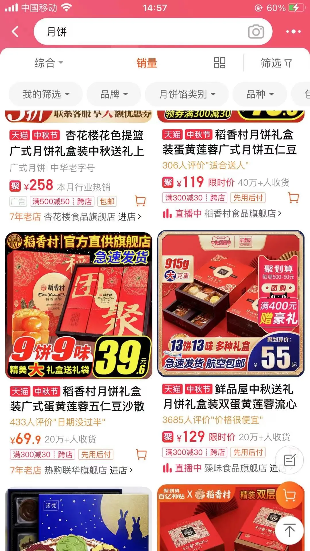 有意思的是,數不清的精緻月餅(禮盒)被製作出來進行售賣。然而,截至發稿前,在電商平台上銷量排名最靠前的,依舊是稻香村、五芳齋……看來,老牌月餅依舊穩坐江山,新勢力們還需要加把勁兒,讓更多消費者願意為其買單。