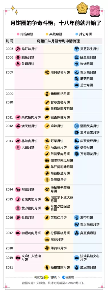 如今,傳統口味的月餅仍是人們主要的選擇,但在新口味的創新上,品牌的不懈努力超乎人們的想象。有人還列舉了2003年開始“奇葩”口味的月餅,今年上榜的則是楊枝甘露月餅,和玻尿酸月餅。