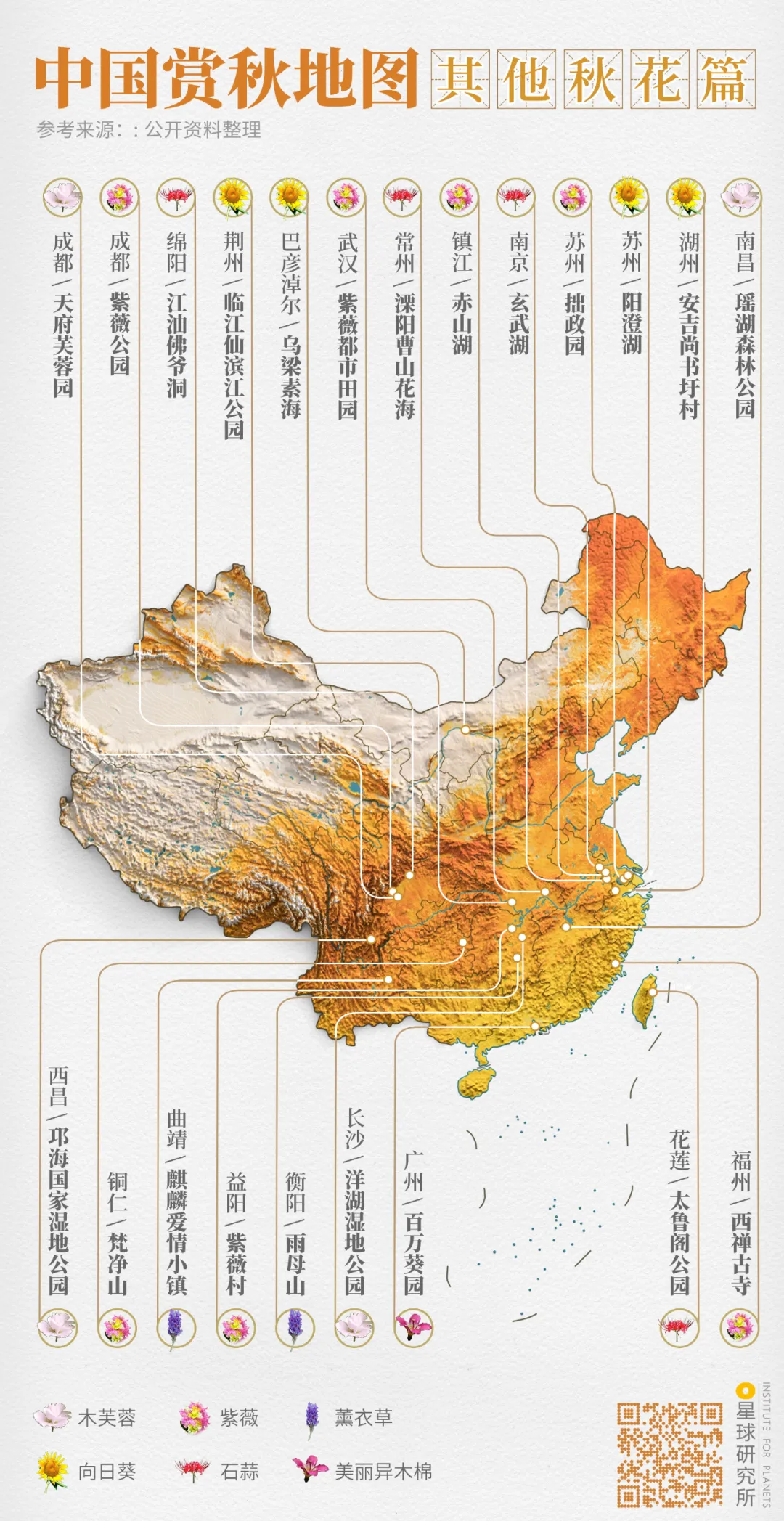(中國賞秋地圖⎜其他秋花篇,製圖@鄭藝&鄭伯容/星球研究所)